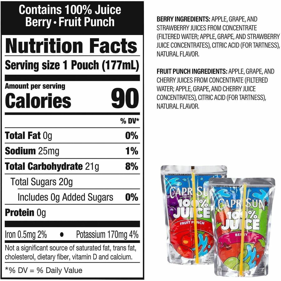 | Marketing Information | Capri Sun 100 percent Juice is a delicious alternative to soda and is not just for kids. Capri Sun Juice Variety Pack contains forty individual pouches and is ideal for stocking the breakroom or vending machines. Flavors include Fruit Punch, Apple and Berry, which coworkers will enjoy. |