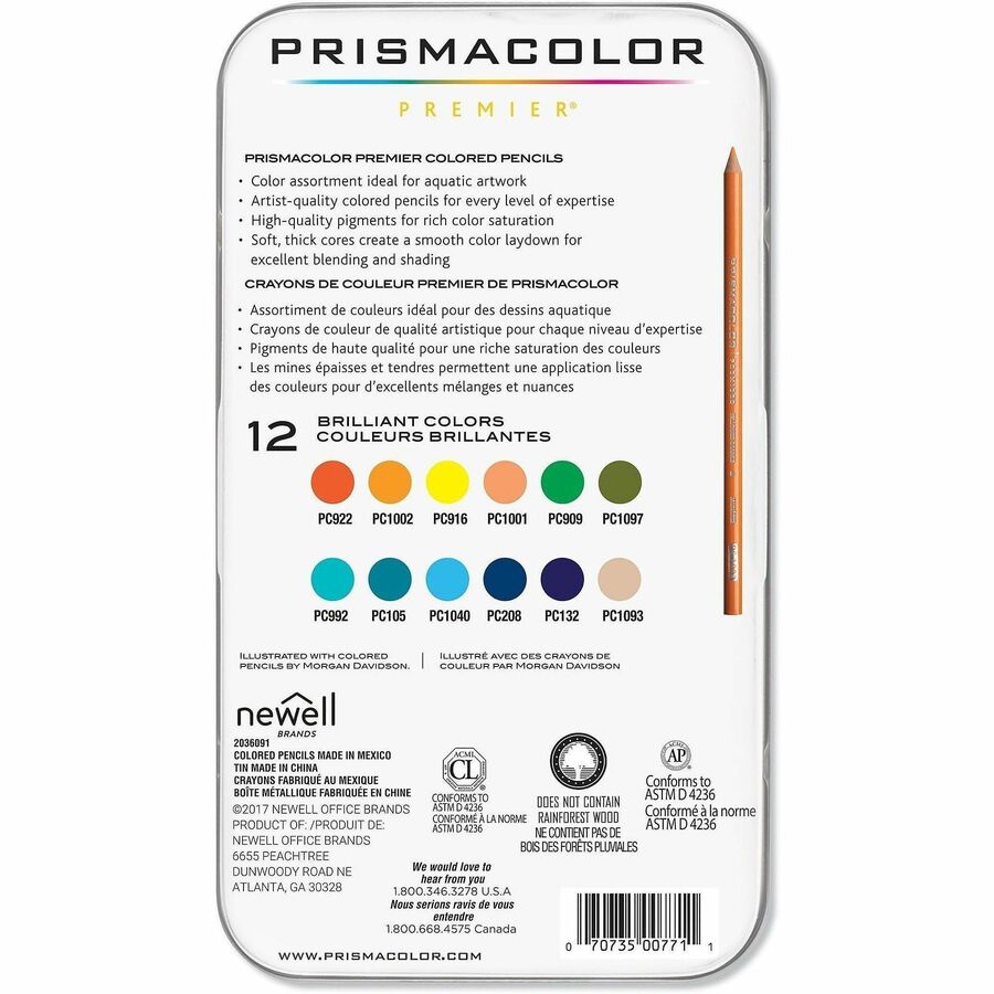 | Marketing Information | Artist-quality smoothness for every level of expertise, these coloring pencils feature supple cores for unbeatable blending and shading. The high-quality pigments breathe brilliant color into your artwork for rich color saturation. Its beautiful range of colors portray the unique colors of the sea to help you bring exciting aquatic scenes to life. Assorted colors include poppy red, yellowed orange, canary yellow, salmon pink, grass green, moss green, light aqua, cobalt turquoise, electric blue, indanthrone blue, dioxazine purple hue and seashell pink. |