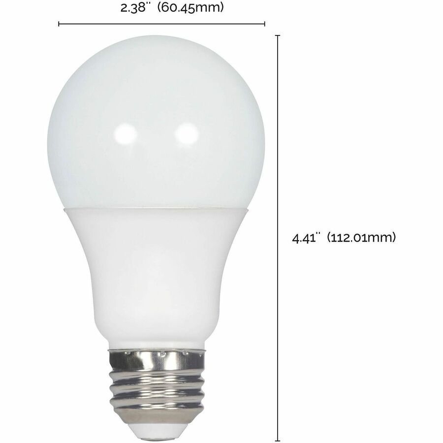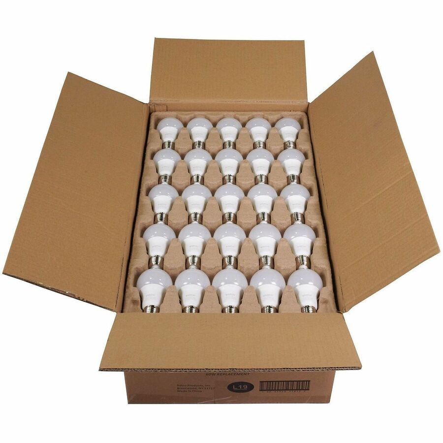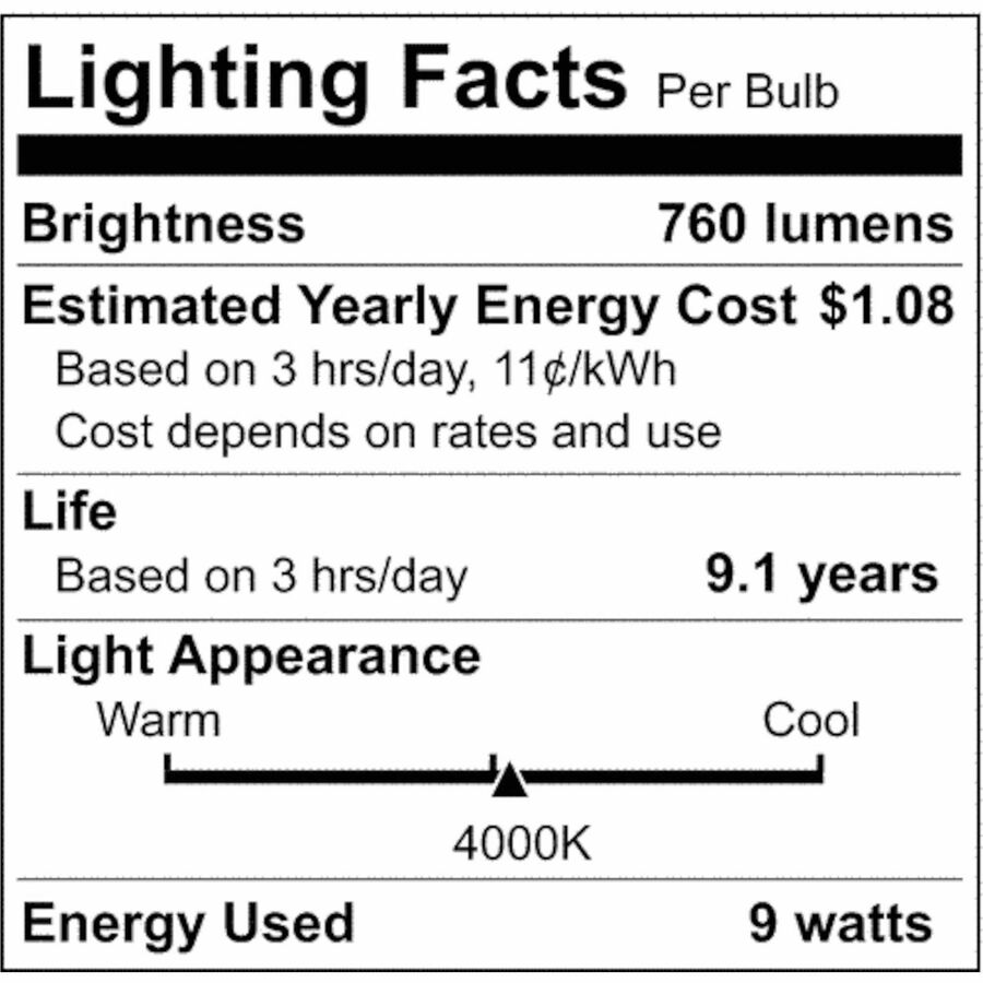 9 W – 60 W Incandescent Equivalent Wattage – 120 V – 760 lm – A19 Size – Frosted – Cool White, White Light Color – E26 Base – 10000 Hour – 4000°K Color Temperature – 80 CRI – 220° Beam Angle – 100 / Carton