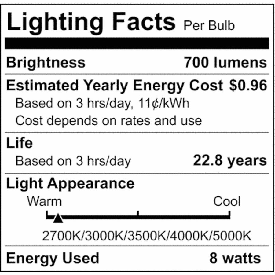 8.50 W – 65 W Incandescent Equivalent Wattage – 120 V – 700 lm – Reflector – BR30 Size – White – White, Warm White, Natural Light Light Color – E26 Base – 25000 Hour – 5000°K Color Temperature – 90 CRI – 100° Beam Angle – Dimmable – 4 / Pack
