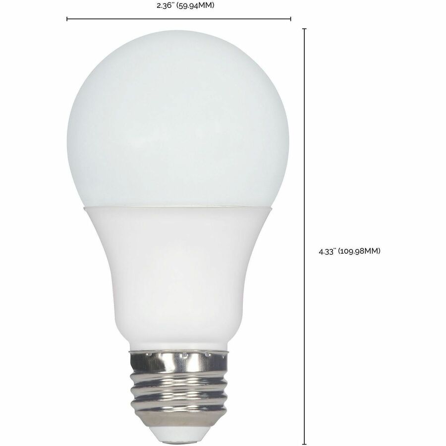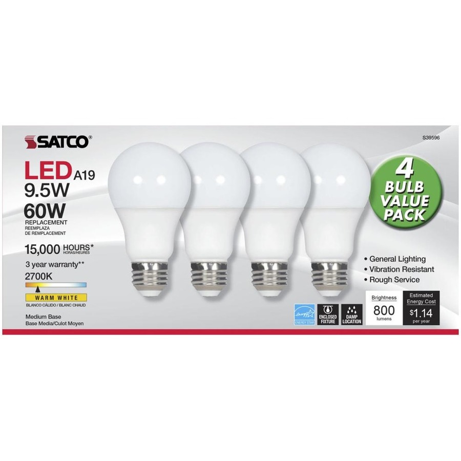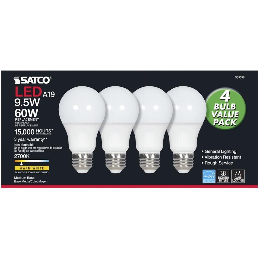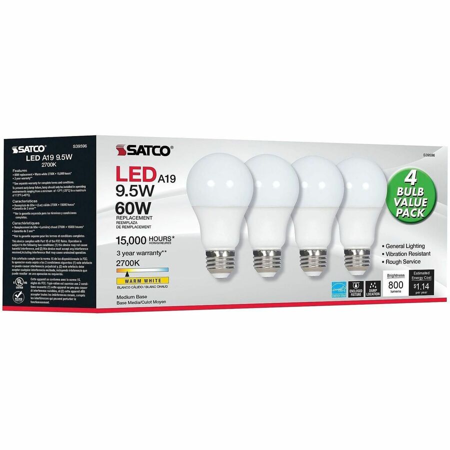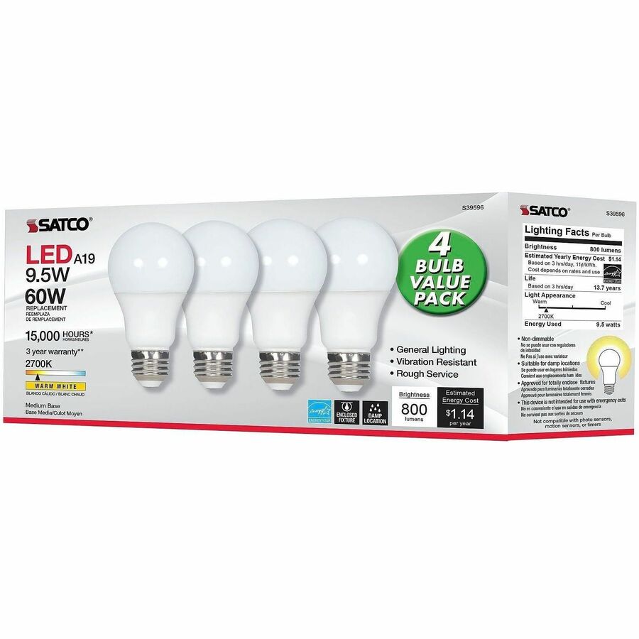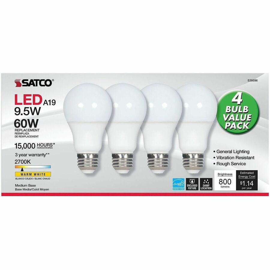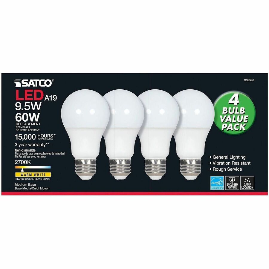 9.50 W – 60 W Incandescent Equivalent Wattage – 120 V AC – 800 lm – A-Shaped – A19 Size – Frosted – Warm White Light Color – E26 Base – 15000 Hour – 2700°K Color Temperature – 80 CRI – 220° Beam Angle – Vibration Resistant – 4 / Pack