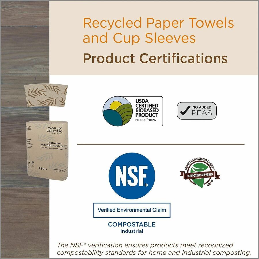 | Marketing Information | World Centric Compostble Paper Drink Sleeves are made from post-consumer recycled paper. Great for grocery stores, cafes and delis serving hot drinks to-go, these eco-friendly takeout drink sleeves are durable and will keep your hands protected. They're USDA Certified Biobased and NSF Industrial Certified Compostble. As a certified B Corporation, World Centric is dedicated to upholding the highest standards of social and environmental responsibility, transparency and accountability. We proudly give 25-percent of our profits to grassroots organizations driving global change. Choose World Centric compostble foodservice products and make a difference today. |